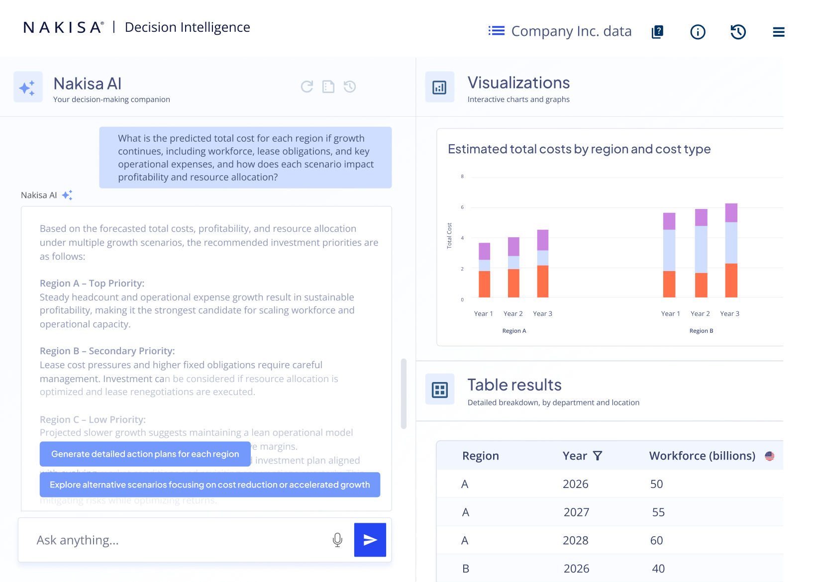 Our agentic solution unifies and interprets vast internal and external datasets across any system in real time. It goes beyond analysis by running forecasts, simulations, and visualizations, while providing expert, context-aware guidance every step of the way. Ask complex business questions in natural language (text or voice) and receive tailored recommendations. It doesn’t stop there; you can execute decisions instantly through Nakisa AI agents and apply them directly to your ERP and HCM systems. Whether planning capital projects, optimizing real estate portfolios, or enhancing facility operations, NDI empowers leaders to move from data to action, faster, smarter, and with greater impact.