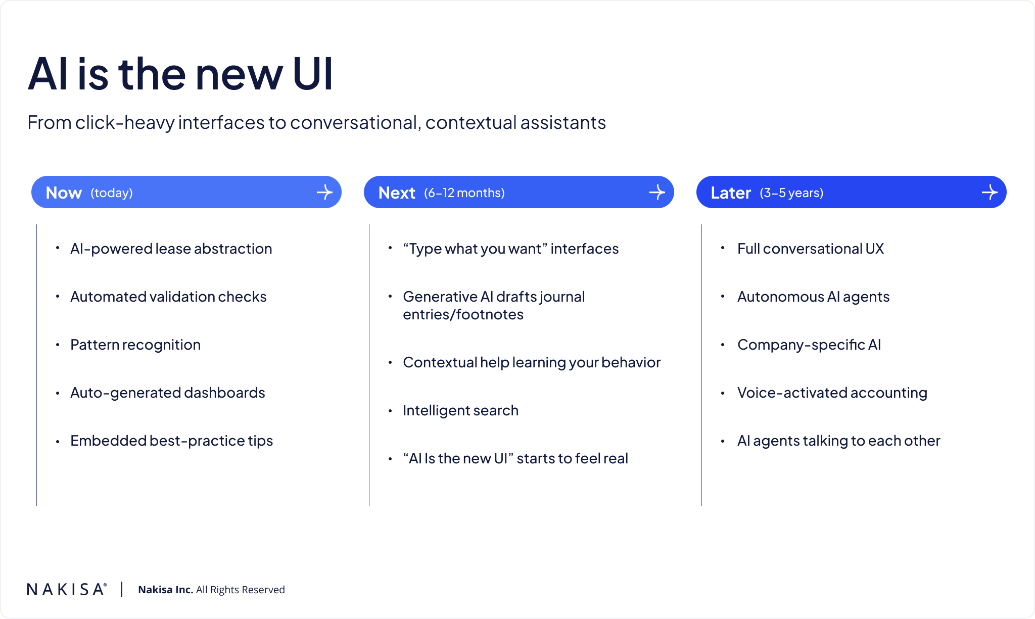 The evolution of AI in lease accounting and management is unfolding in clear stages, redefining how finance teams interact with systems. As AI progresses from reactive support to autonomous execution, it transforms user experience from interface-heavy workflows to intelligent, conversational engagement, streamlining tasks, anticipating needs, and autonomously executing actions. Here’s what that journey looks like: