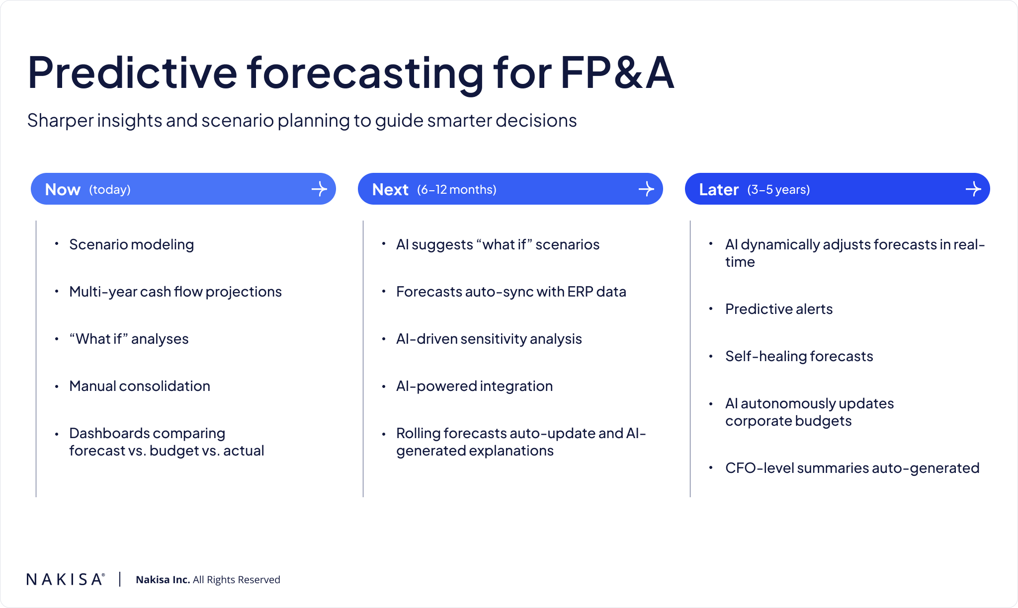 The diagram illustrates the shift from manual financial planning to AI-powered insights and automated forecasting across three stages: present, near-term, and future.