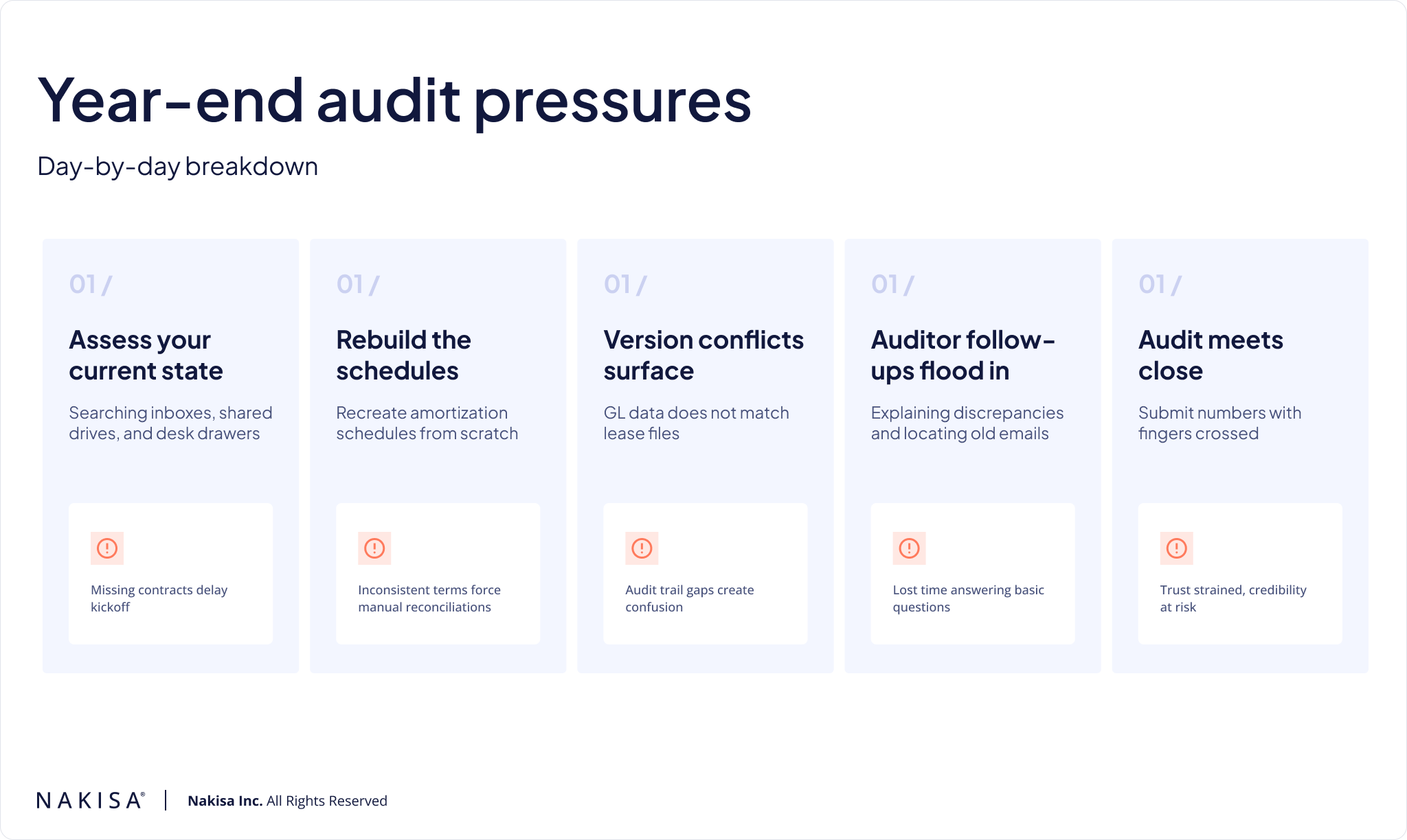 Year-end audits are especially challenging for organizations that still manage leases manually. Fragmented data, siloed systems, and outdated workflows turn what should be routine processes into last-minute scrambles, forcing accountants to track down contracts, rebuild amortization schedules, and reconcile mismatched data under tight deadlines. A single missing addendum or broken formula can lead to costly errors, restatements, or audit delays. Here’s a day-by-day breakdown of how a typical year-end audit unfolds when leases are managed manually: