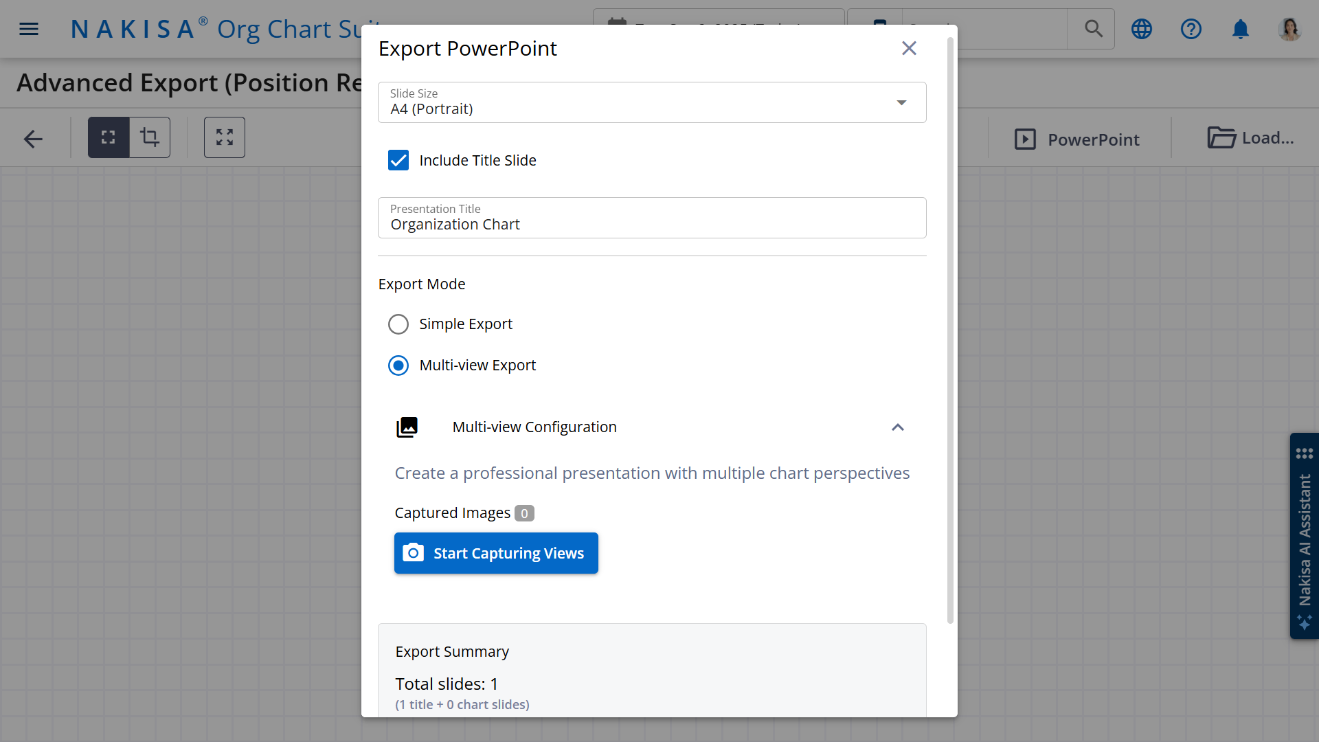 The export to PowerPoint is automatically enabled and available to all users in the latest version of Nakisa Org Chart. Access the usual export options, and the PowerPoint functionality will be there.