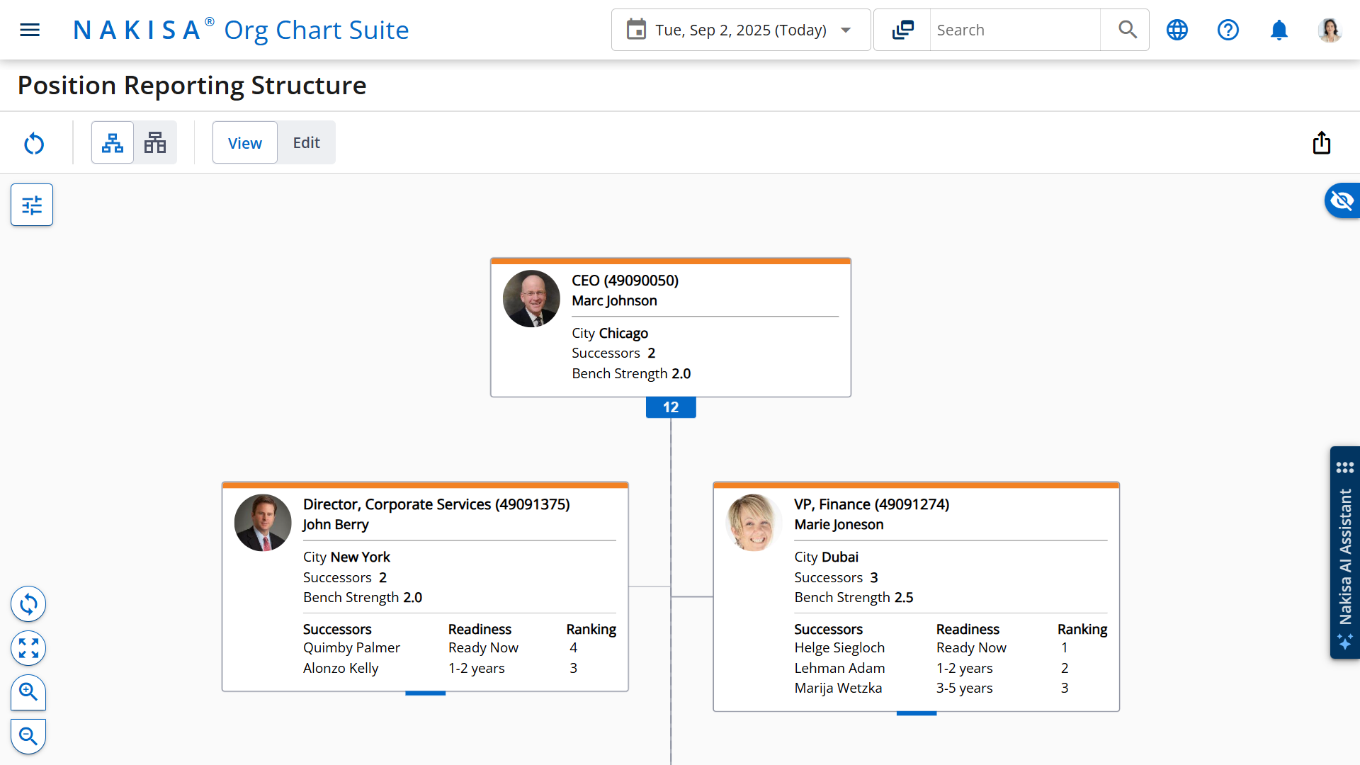 The succession view allows users to view different successors, bench strength, and readiness for positions directly on the org chart.