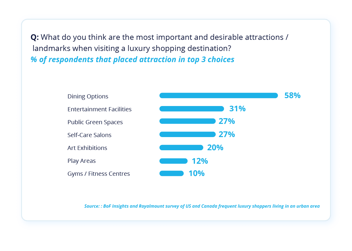 3. Brick-and-mortar stores and malls redefine their format and look for new ways of attracting people. Retailers are shifting their focus from merely selling products to creating immersive and engaging experiences for consumers. This includes interactive store layouts, pop-up shops, entertainment events, photo zones, and augmented reality/virtual reality experiences that enhance customer engagement and foster brand loyalty. One of the numerous examples is the Nike House of Innovation in NYC and Paris. It’s no longer just a store, it’s a Nike museum and an interactive playground where visitors can discover the history of the brand, exercise, learn more about healthy lifestyles, and create a customized pair of shoes by choosing colors and features they like. Luxury retail is pushing the boundaries of store formats with even more experimentation. The Business of Fashion (BoF) has an interesting survey on Evolving Art of Luxury Experimental Retail where they speak about adapting new activities for luxury stores to let people stay longer in their stores and deepen their connection with the brand thanks to surprising and inspiring experiences. For example, Le Bon Marché supports art exhibitions and regularly hosts concerts, readings, and other activities. The Business of Fashion also shows that adding dining options, entertainment facilities, and public green spaces are the top 3 attractions for shoppers: